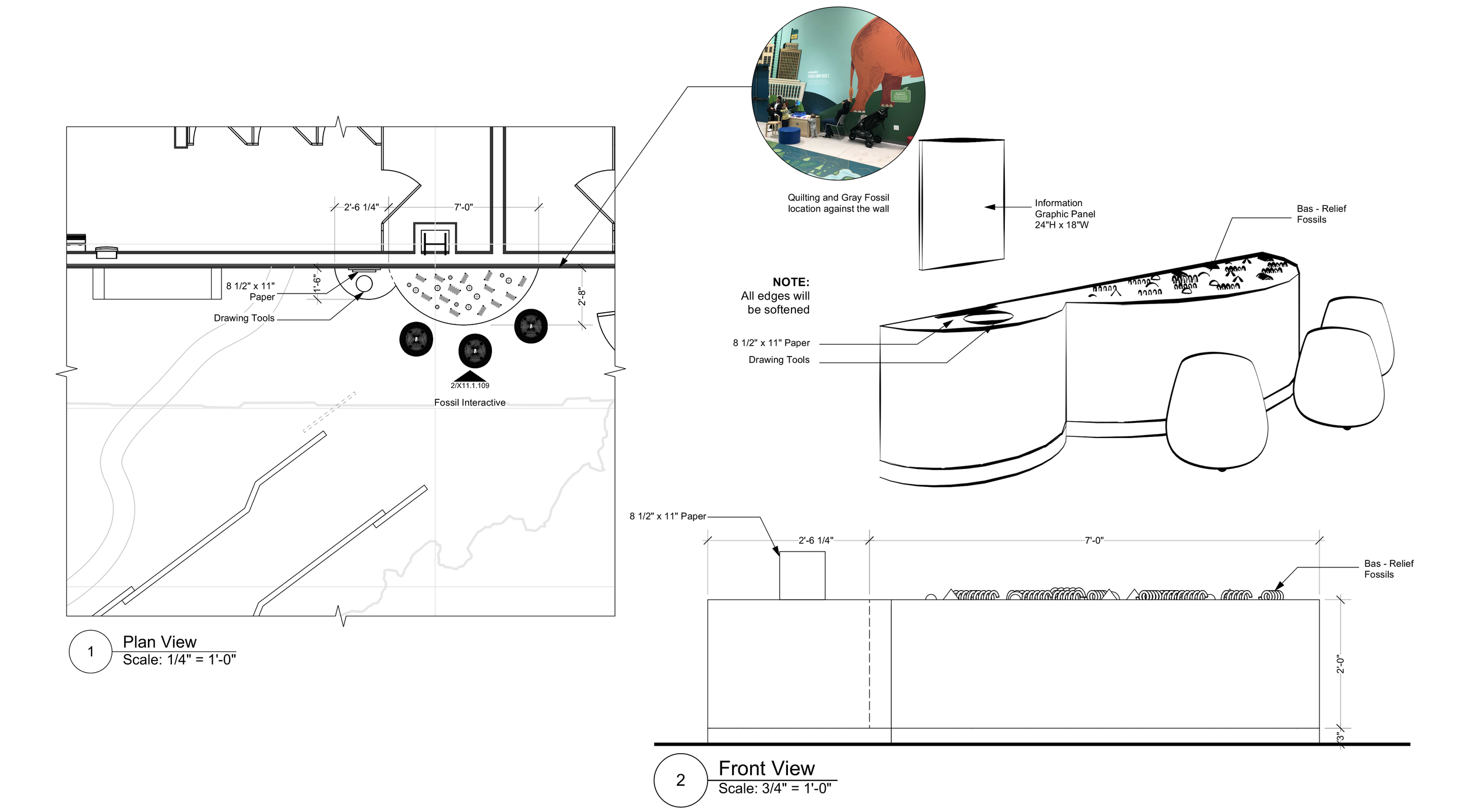 There is integrated storage for pen and pencil for children to draw. The table is inspired by clouds to represent Tennessee sky since overall gallery is based on different facts of Tennessee.