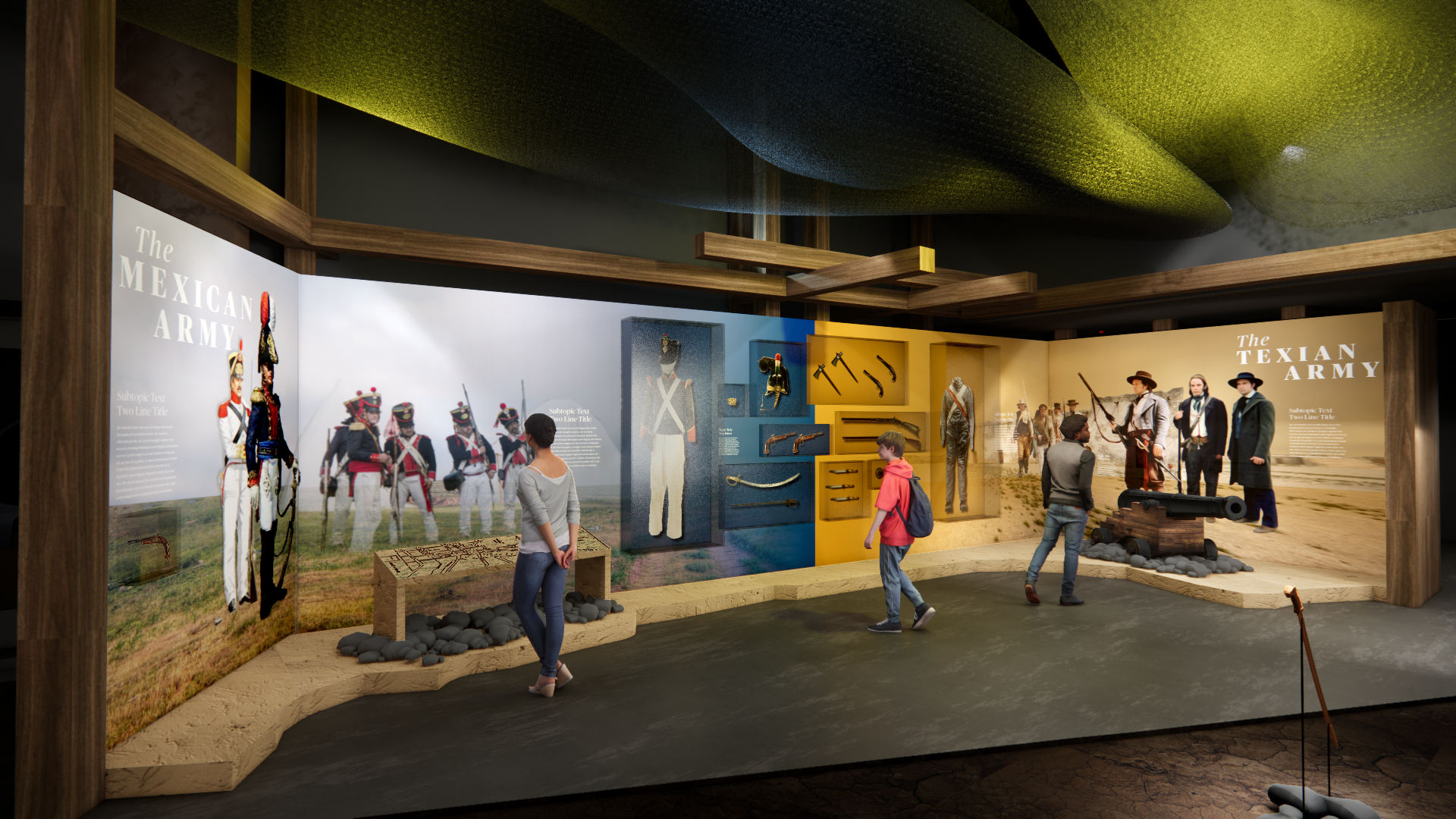 Representative physical objects that respond to visitors’ touch invite them to come closer and listen to key individuals’ stories from this critical period in early 1836.