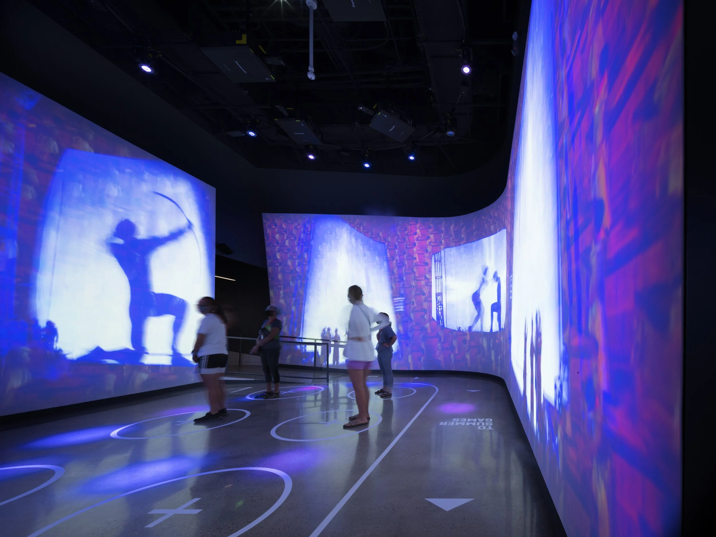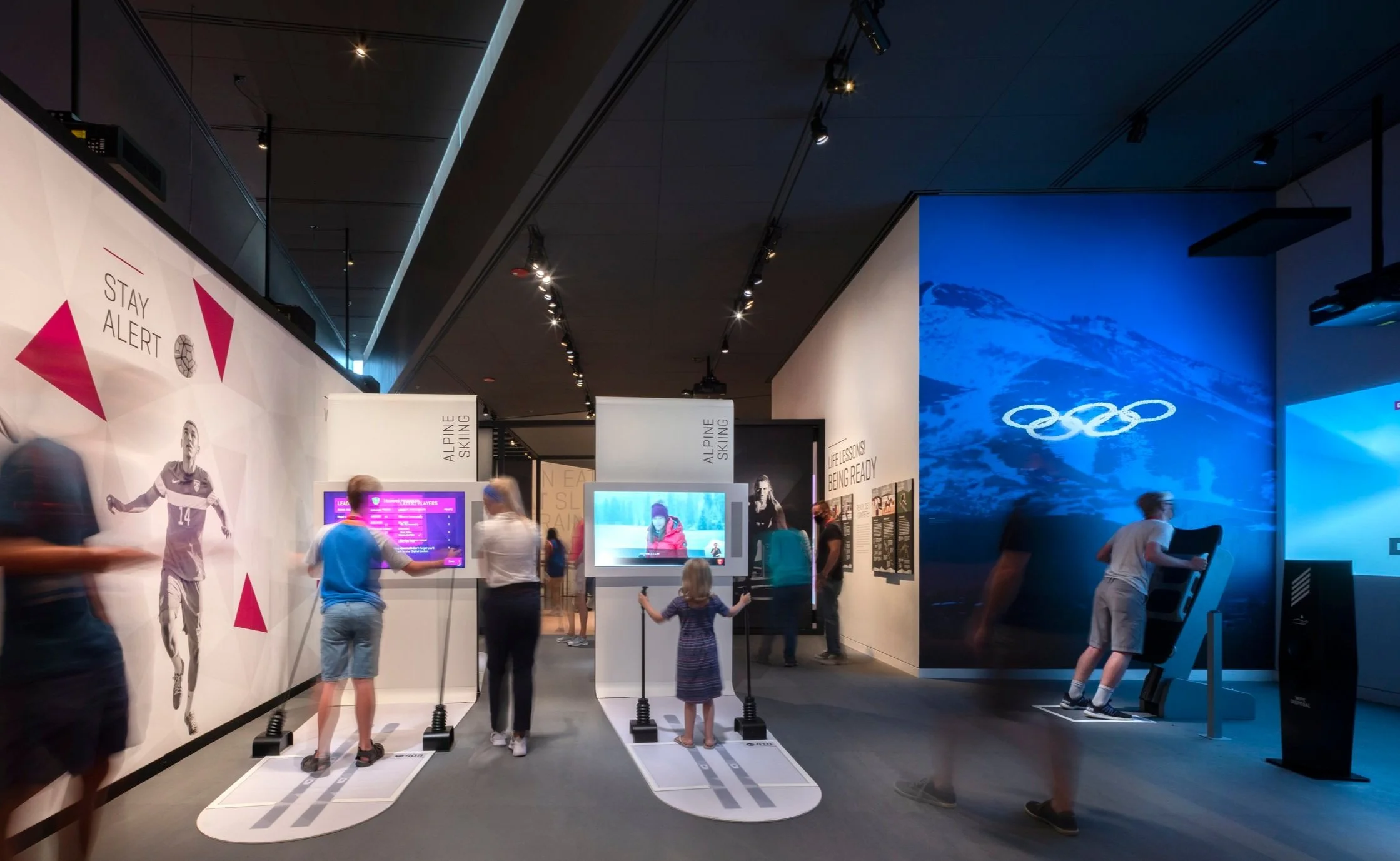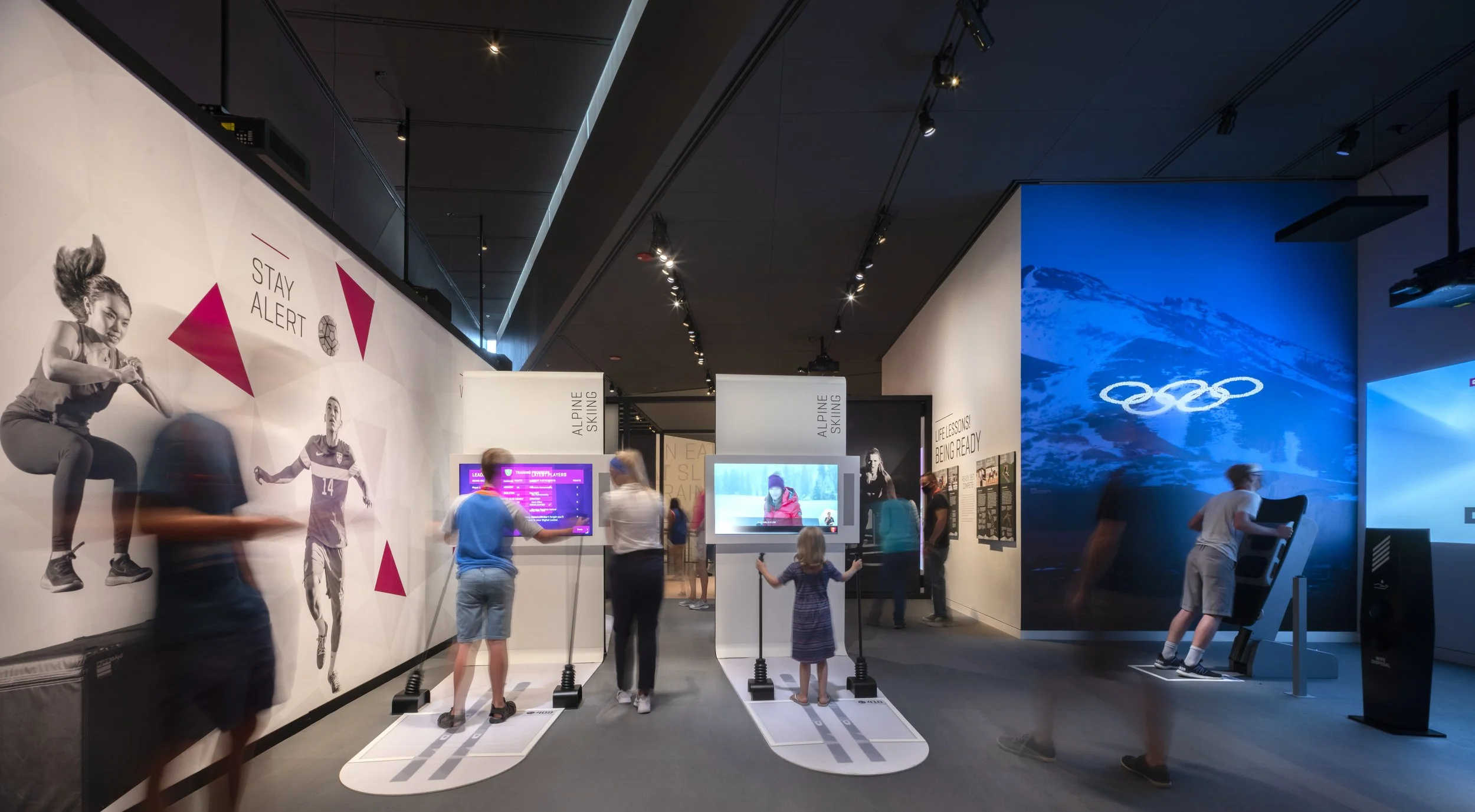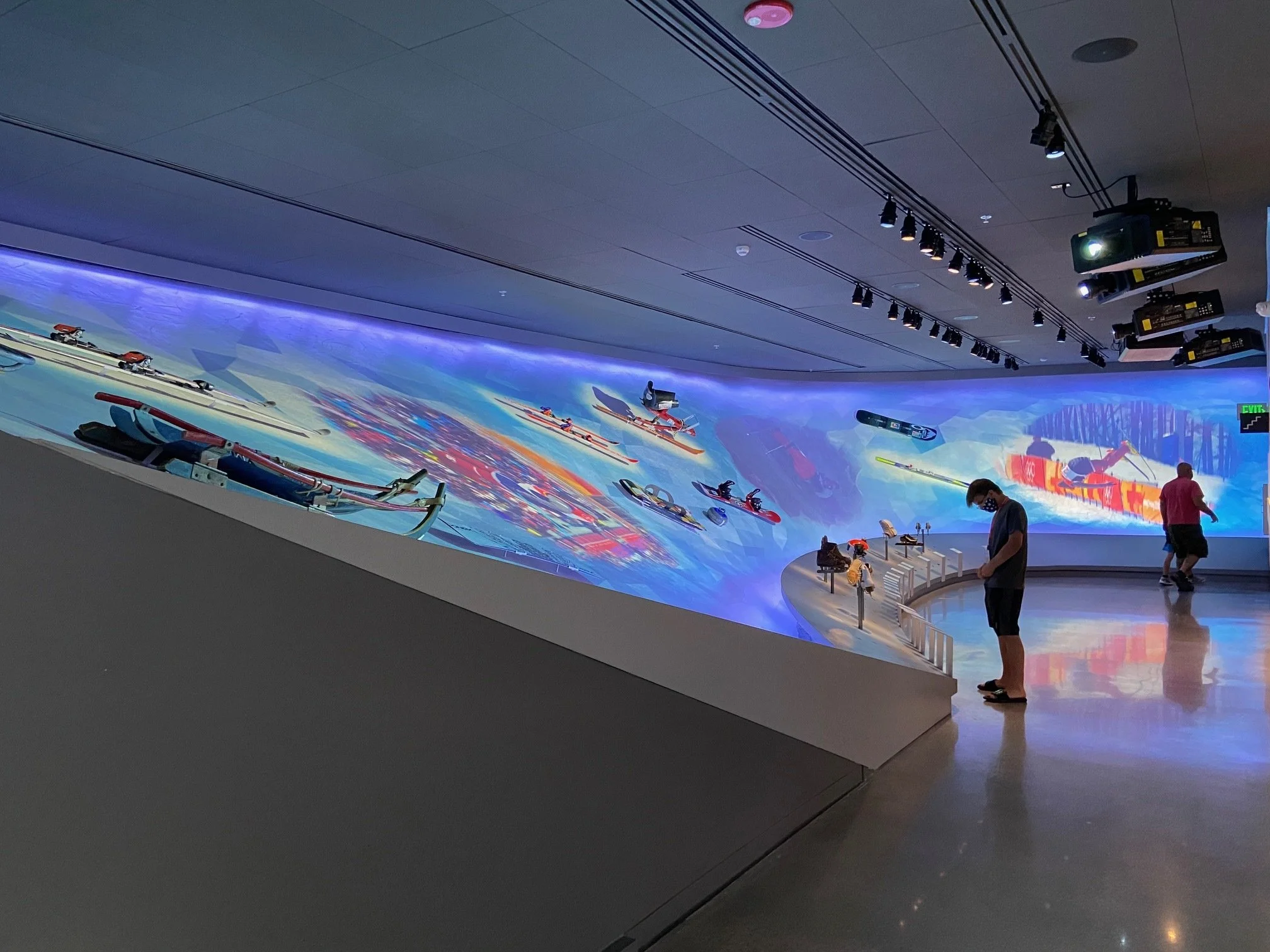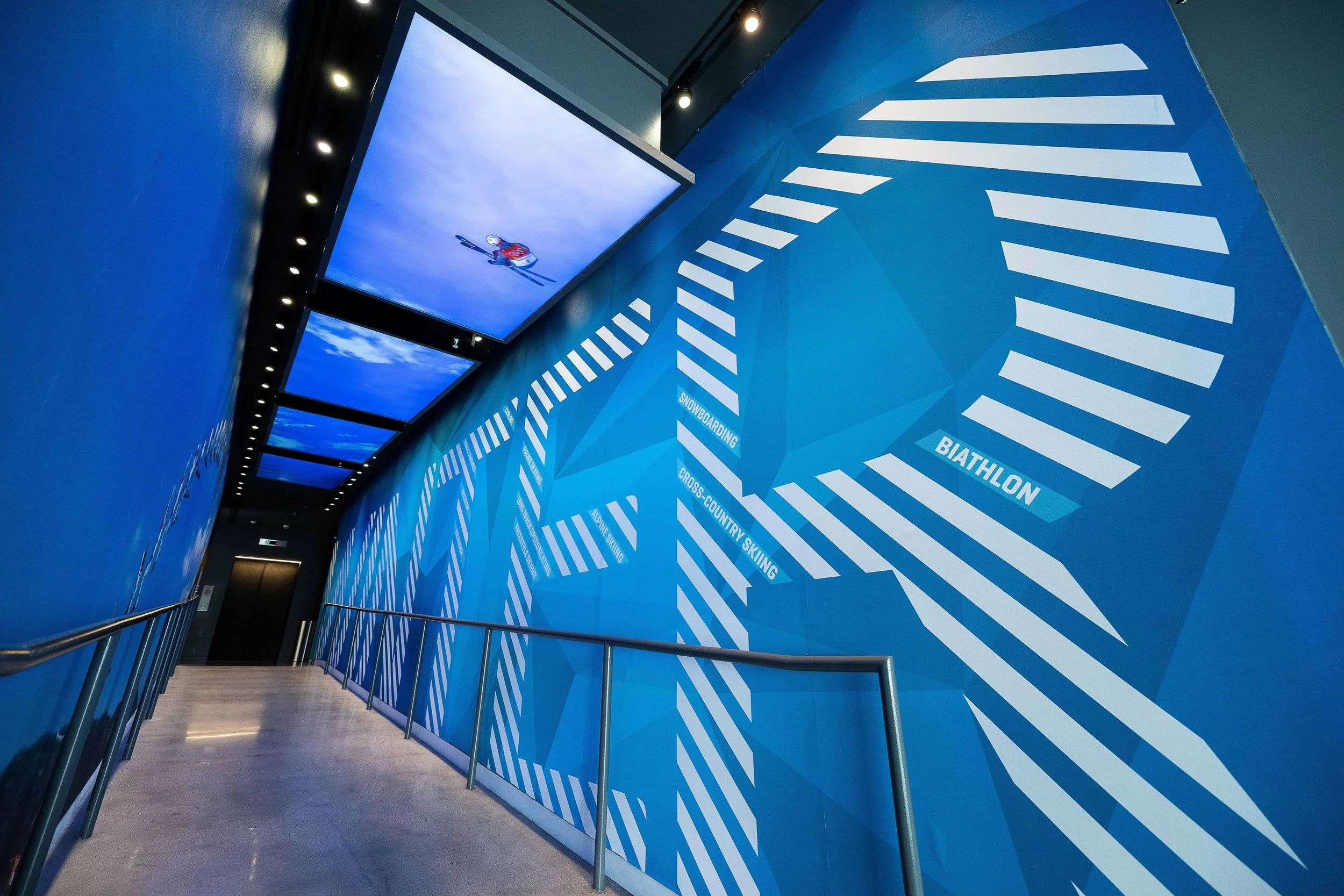 The entrance to the Winter Games gallery features skiers and snowboarders flying overhead as visitors walk down.