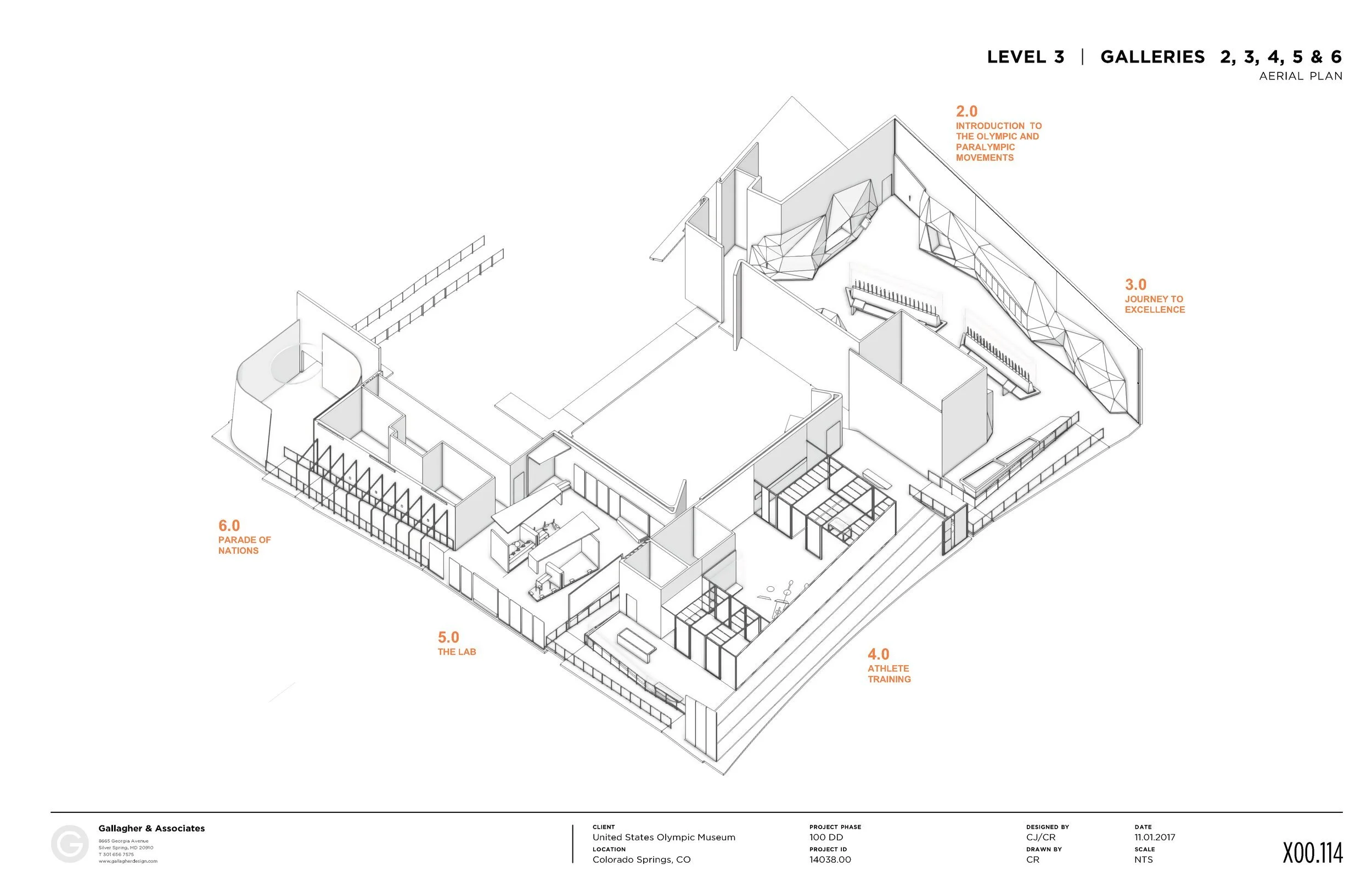 The Conceptual Design phase of the project which began in 2014 Early versions of the gallery concepts were provided to the building architects and helped inform the architecture. The specific designs of the galleries went through many iterations, in response primarily to the unique geometry of the building shell and exploration of initial core concepts.